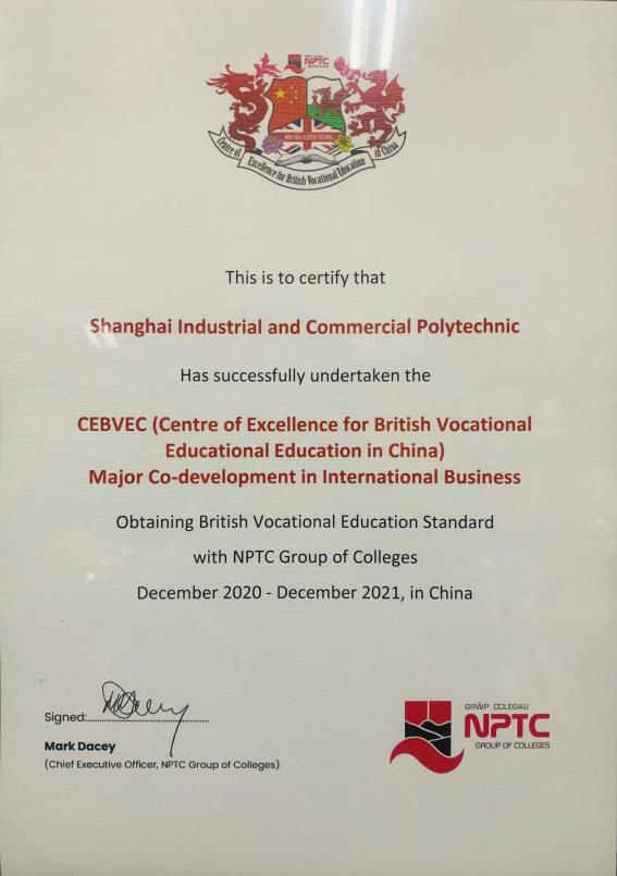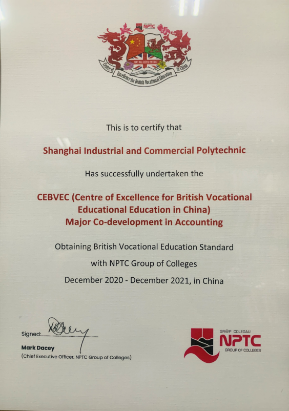 为更好提升学校专业建设水平,提高伟德betvicror国际质量,更好地建设高水平职业院校,学校于2020年开始与英国尼斯港塔尔博特学院合作举办中英职业教育专业共建项目。通过与英国尼斯港塔尔博特学院数位职业教育专家深度交流与探讨,学校于2022年顺利完成了中英职业教育卓越中心CEBVEC项目,取得了会计专业与国际商务专业专业共建的认证证书,为学校人才培养提供新思路。