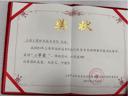 近日,2023年度上海市高等职业院校汽车类专业教师教学能力比赛圆满落幕,我校智能制造与汽车学院教师叶建农、刘忠义、沈庚凭借出色的表现荣获比赛二等奖。